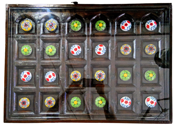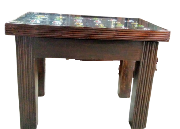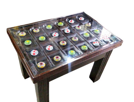Materials: Original bharmatik segun wood. table top glass and under the glass ceramic nob.