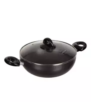 Kiam non stick karai. Attractive design & shape Strong handle and can resist fire. Material: 100% alluminium made body. No-sticky coating what can save 60% of your oil, ghee and butter. Thick Pan, Scratch Resist, Easy to Clean, Non-stick From Germany. Good Quality.