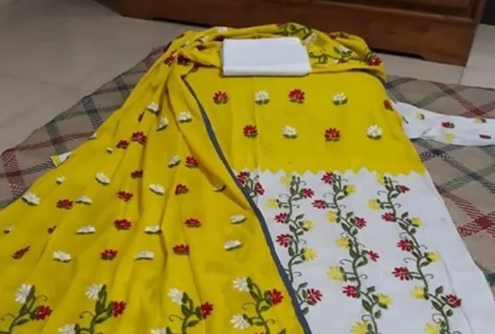 Jessore hand made salwar kameez with Arvind voyel fabrics, soft, color full and gorgeous. Yellow and white color combination. Unstitch cloth.